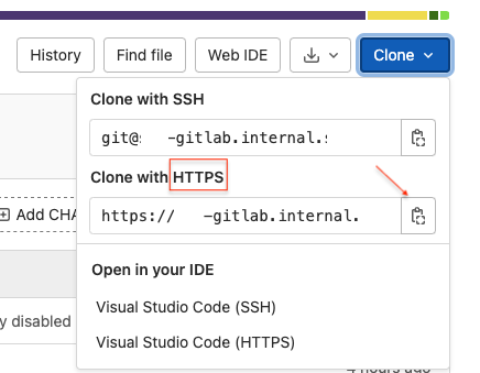 - Enter the Repository URL. To obtain the URL, in your GitLab repo, click the Clone button, copy the HTTPS (SSH is not supported).