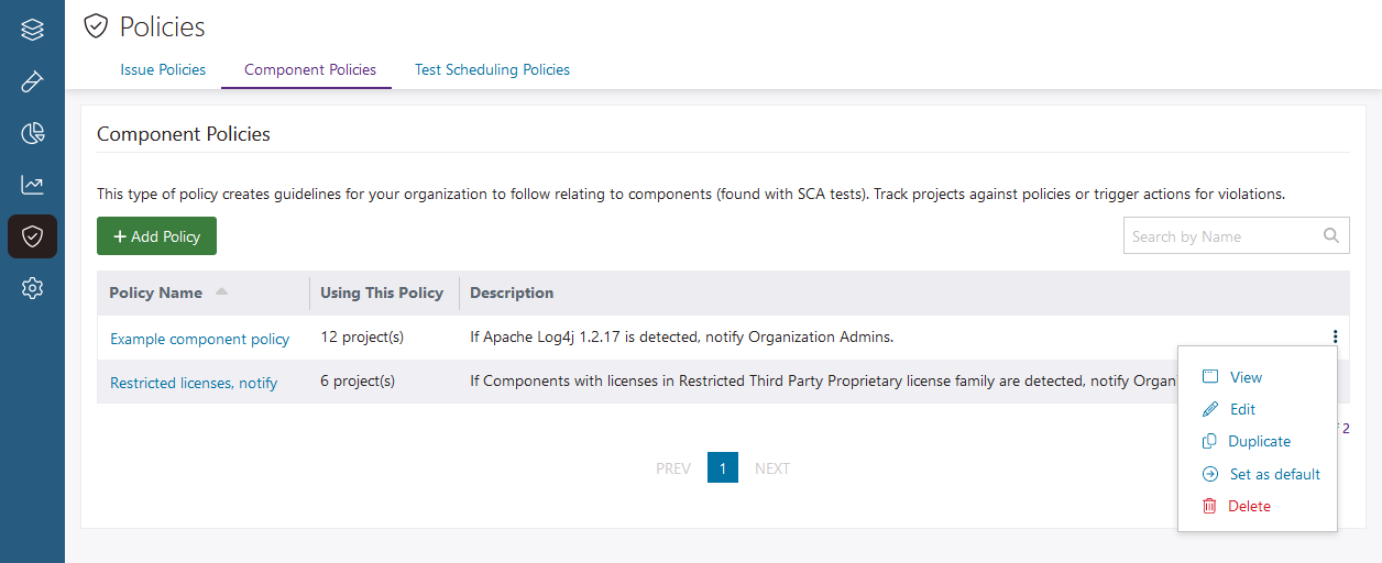Use component policies to automate actions when components with specific properties are detected in a test an SCA test.
