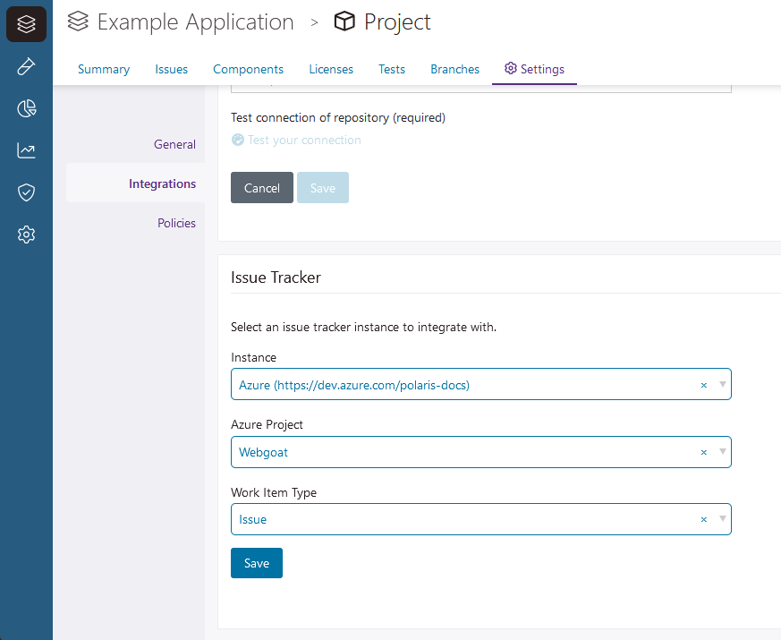 This page describes the issue tracking integration for Azure DevOps, and what you need to do to connect Polaris to Azure DevOps. Once configured, the issue tracking integration allows Polaris to create tickets in Azure DevOps for issues captured in Polaris.
