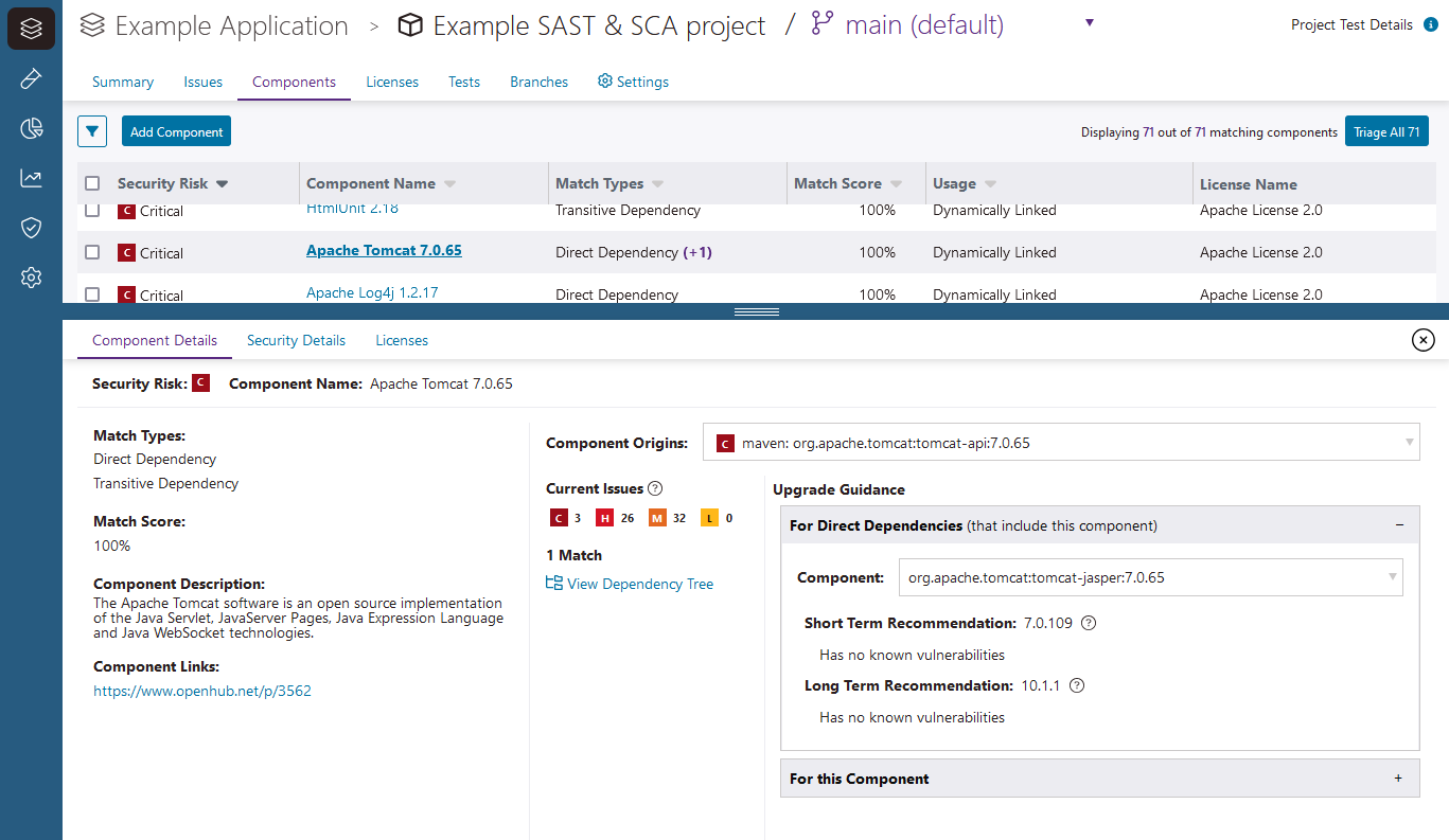 Note: If the component origin you select is a transitive dependency of another component in the project (in this example, org.apache.tomcat:tomcat-api:7.0.65 is a transitive dependency of org.apache.tomcat:tomcat-jasper:7.0.65), upgrade guidance is categorized. Use upgrade guidance under For Direct Dependencies to update the parent component.