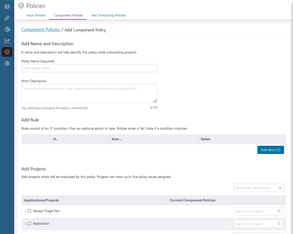 You can add up to five rules to each component policy. Rules control what actions occur when test results violate a policy (when components with specific properties are detected in an SCA test). Set up rules to monitor tests for components with any combination of the following properties: